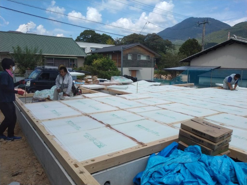 筑紫野市K様邸の幸せづくり状況です! 土台敷きの様子です♪ 完成した基礎の上に、床下の換気をとるための「基礎パッキン」を設置し、その上に、土台や大引を設置します! それが終わると、その上に床下の断熱材を設置する工程まで進...