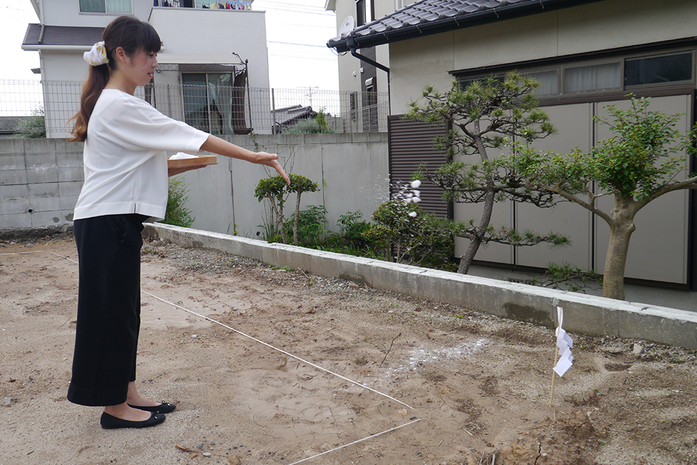 四方祓いでは敷地の四隅に酒塩を撒き、祓い清めました!