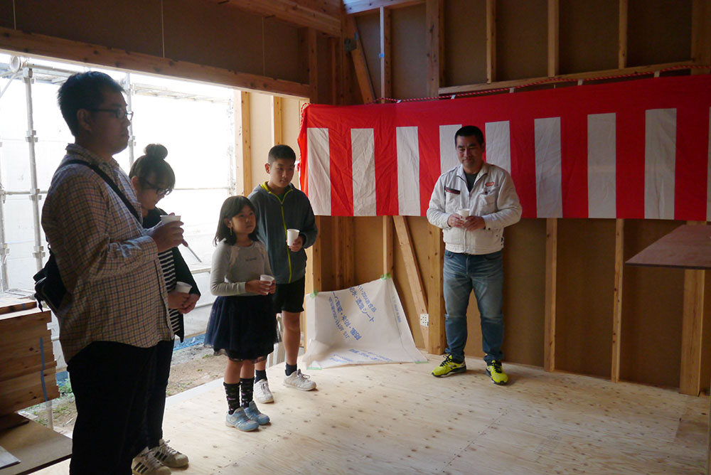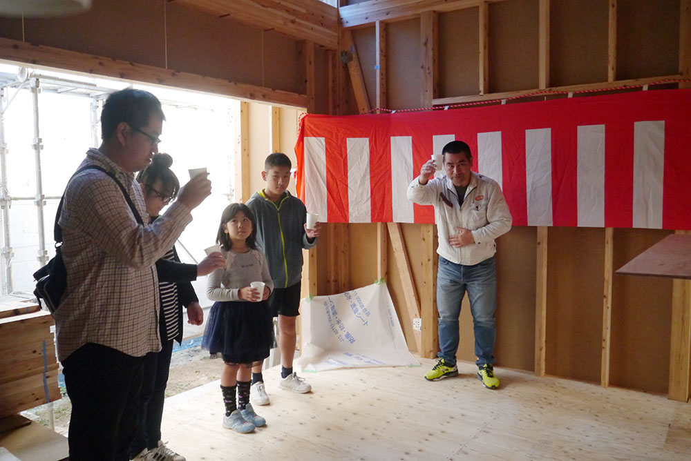 棟上げが何事もなく無事に終わった事を感謝し、そしてこれからの工事の無事安全を願ってお神酒で乾杯します!