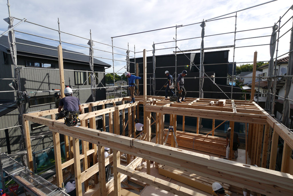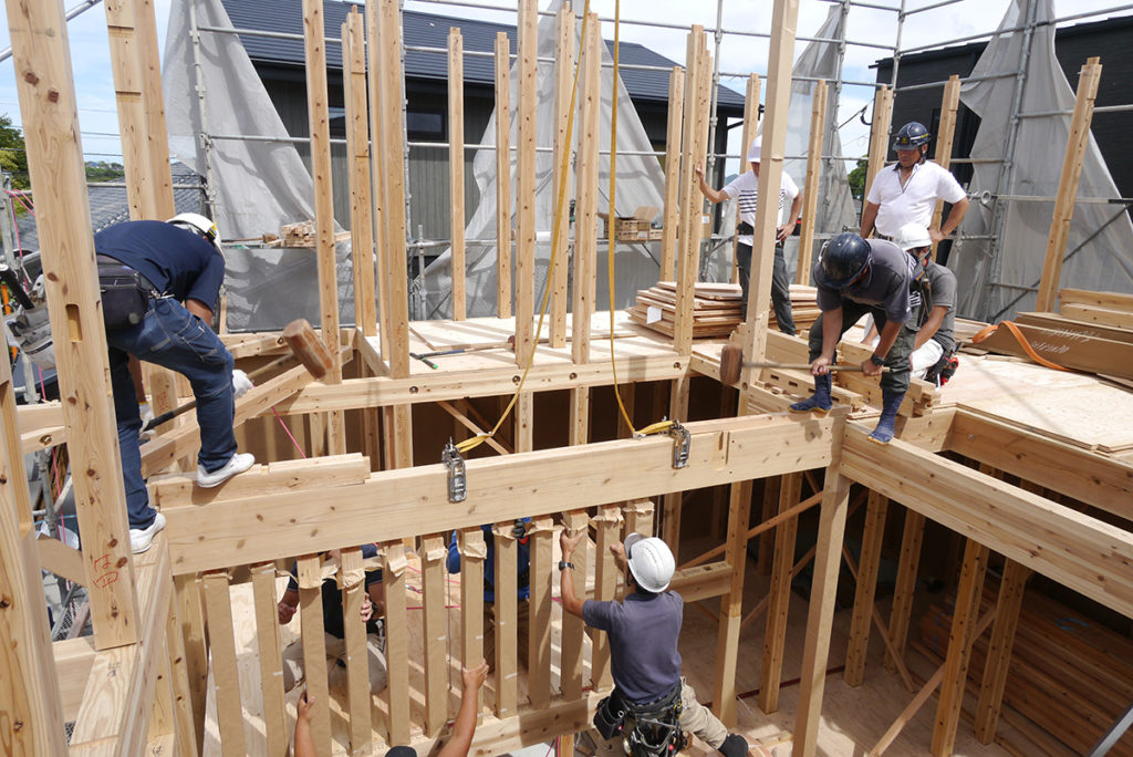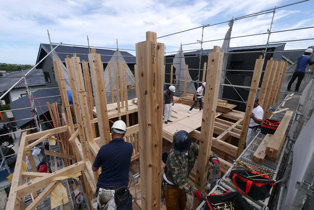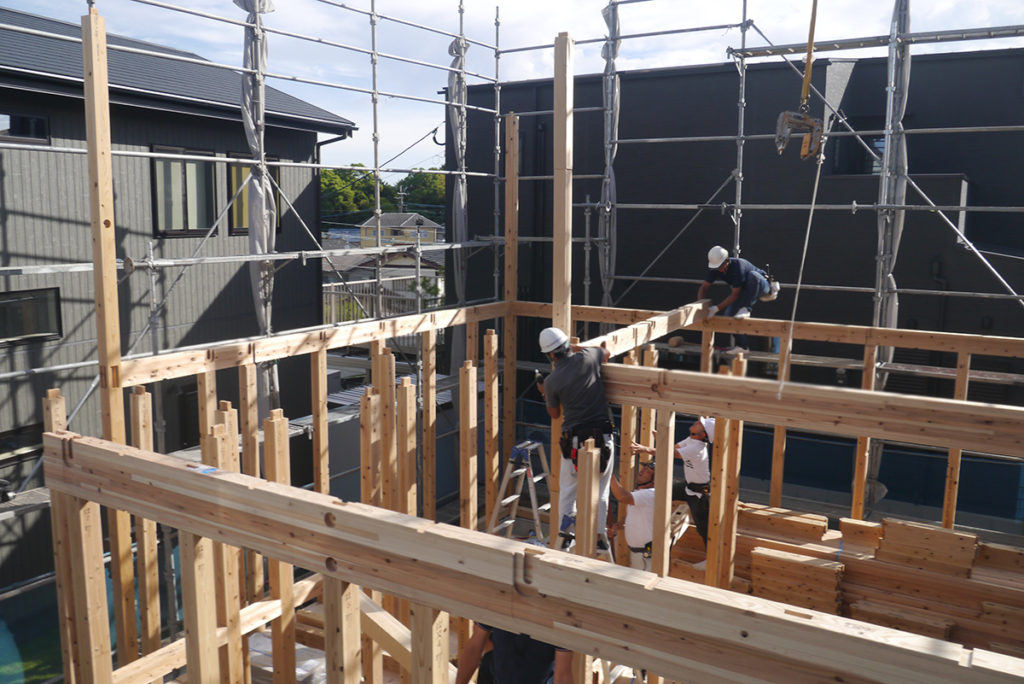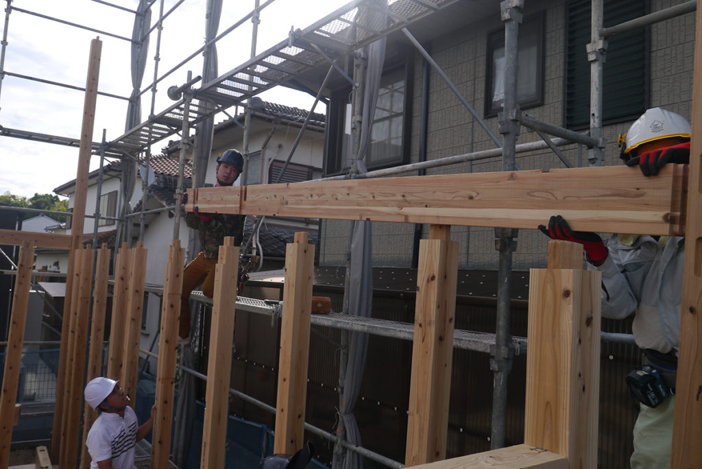 2階の床梁に合板を貼り、さらに2階の柱を立てていきます!