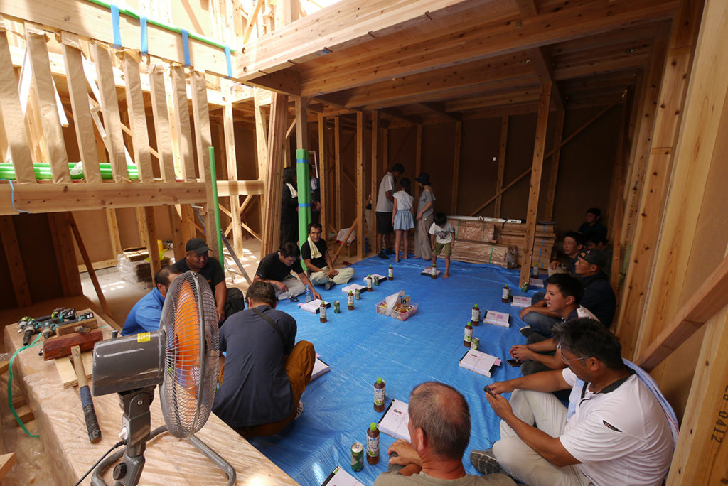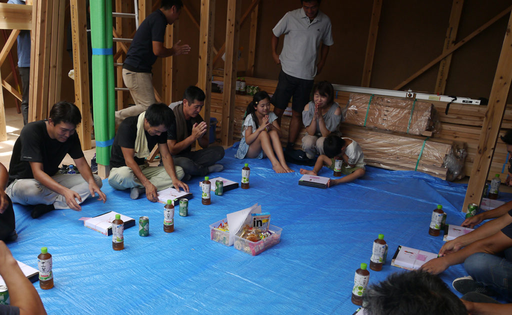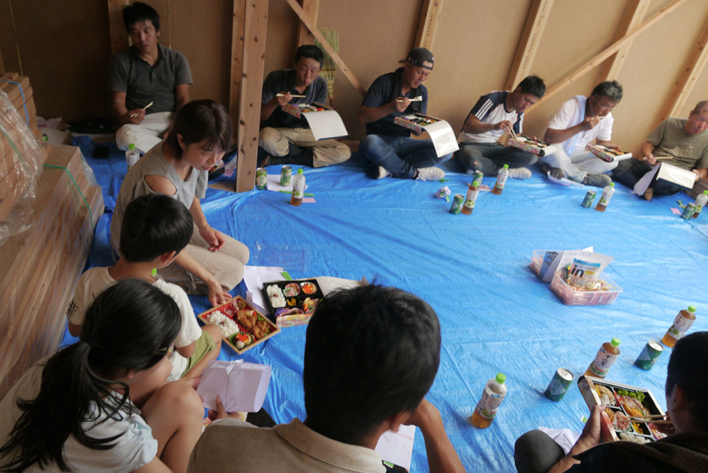 棟上げの日はこうしてお施主様、大工さんと一緒にお昼をいただきます!