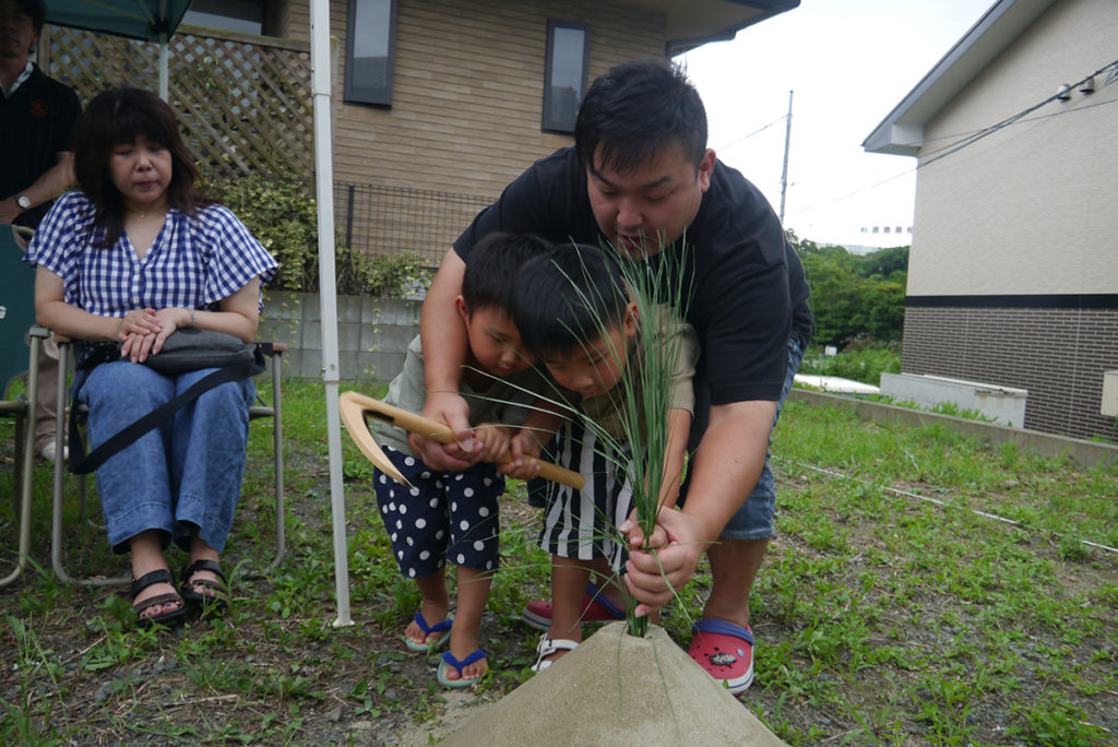 刈初めの儀では、鎌で土地の草を刈り、工事が始まることを伝えます!
