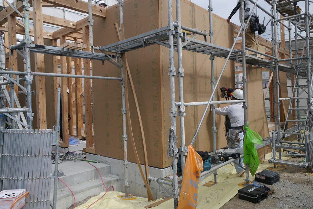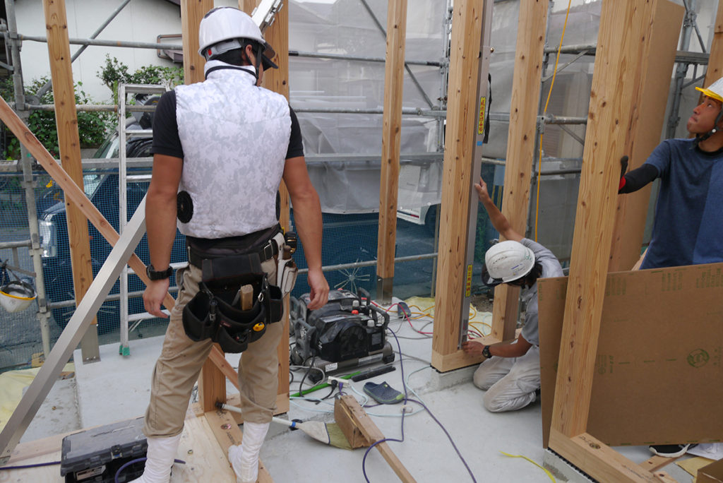 柱を立てつつ、壁にはハイベストウッド(耐力面材)を貼り、壁の強度を高めます!