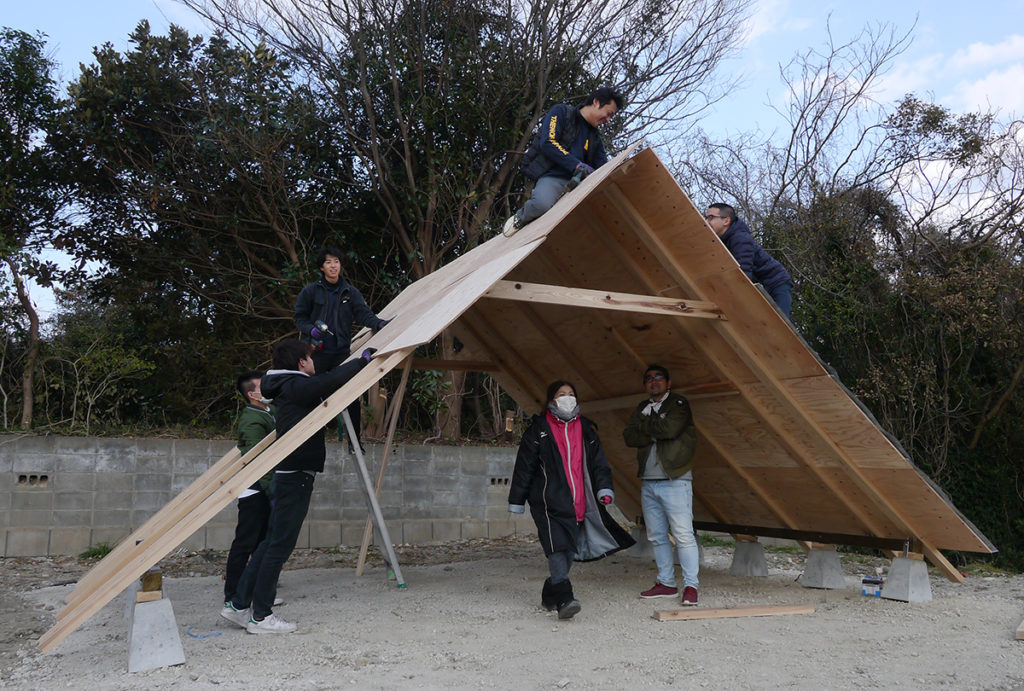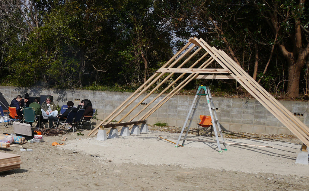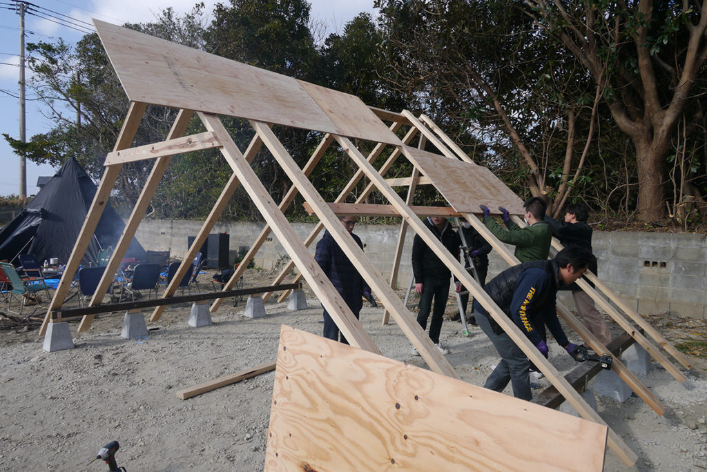 この日、学生さんたちは午前中から集合し、竪穴式住居をモチーフにしたアウトドアスペース作りを行いました!