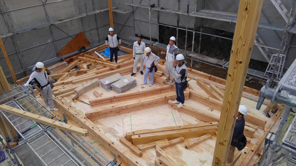 2階の床板を貼り、柱を立て、梁を架けます!