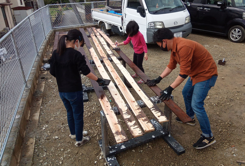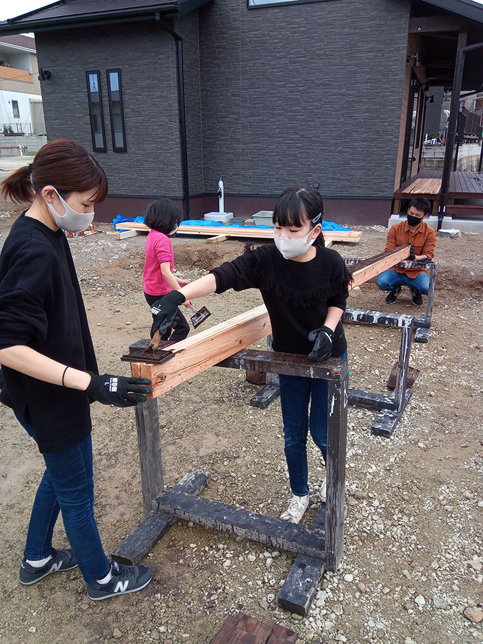 まずは皆さまで、木を保護するための塗料を塗ります!