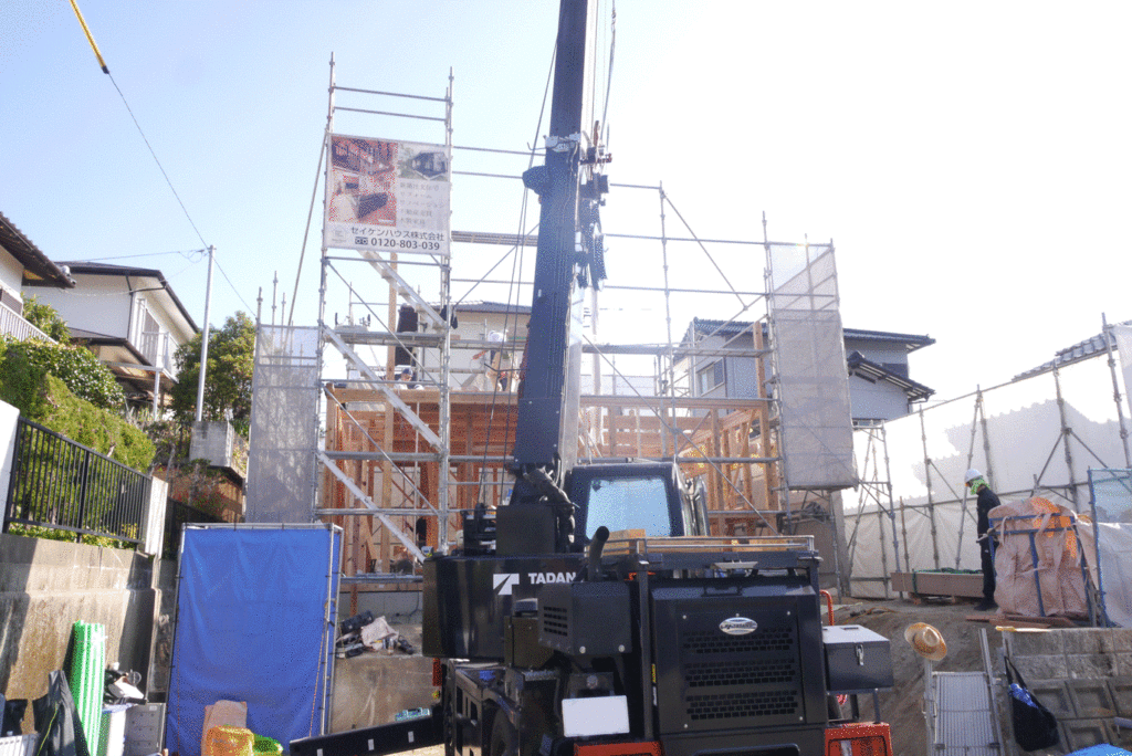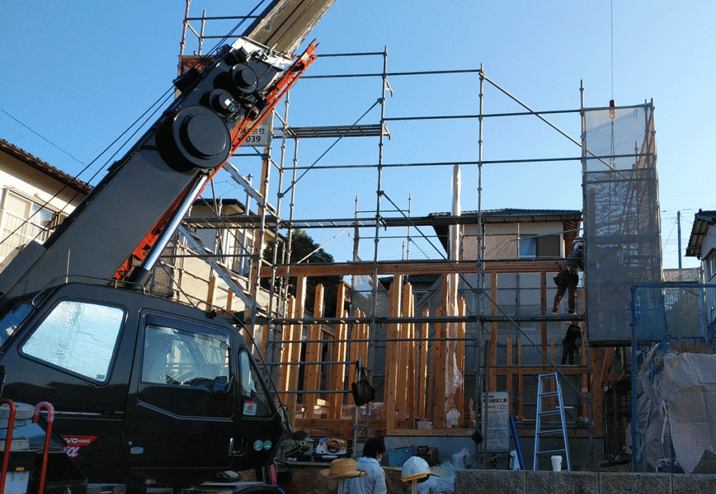 クレーンで一気に部材を運び込めるので、昔に比べて作業スピードがぐっと上がりました!