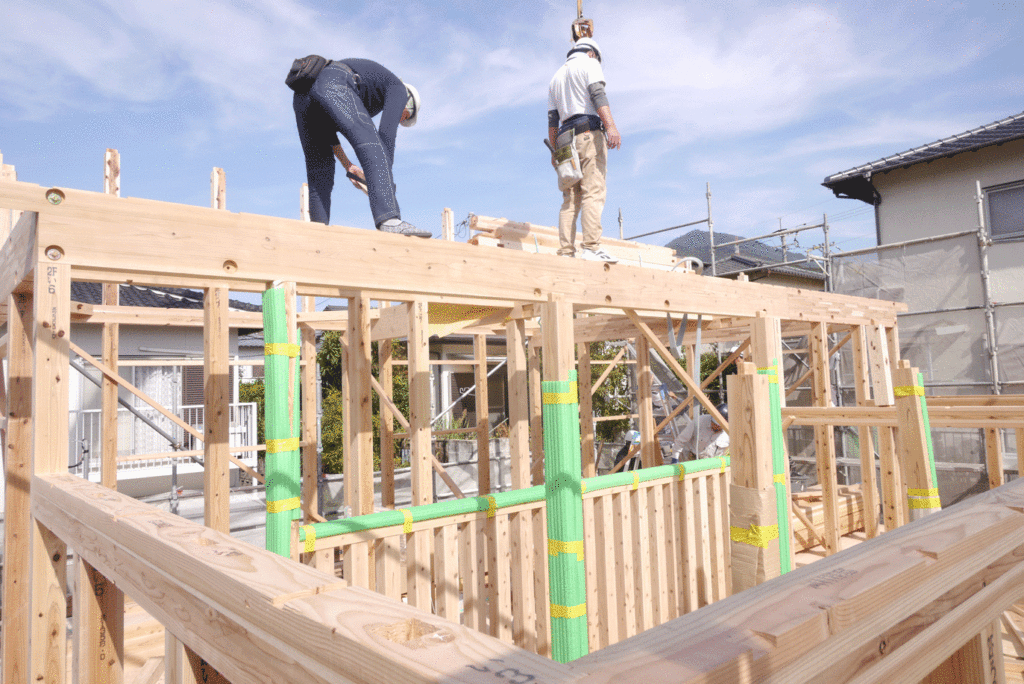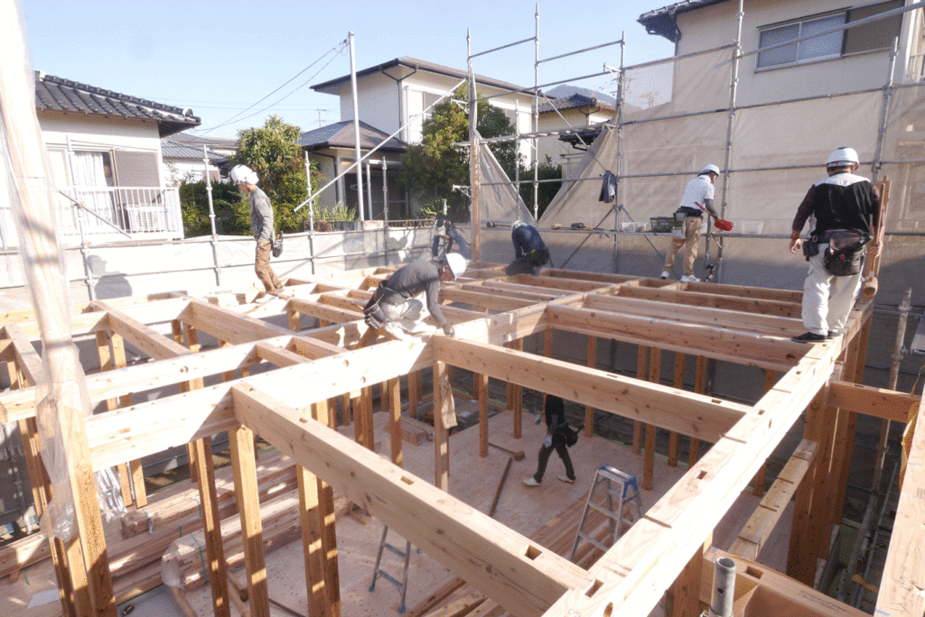 1階から屋根までを一気に組み上げていくので、棟上げの日はたくさんの大工さんの協力が必要になります!