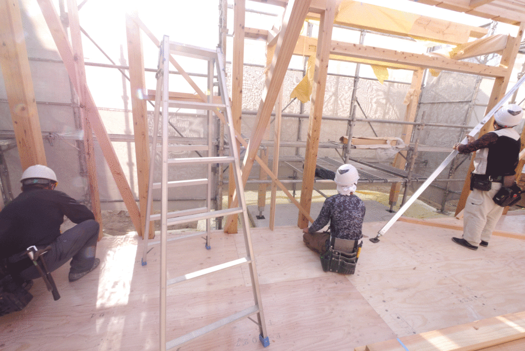 1階の柱を立てる際には、垂直の精度が悪いと柱が斜めになってしまい、建物全体が歪んでしまいます!
