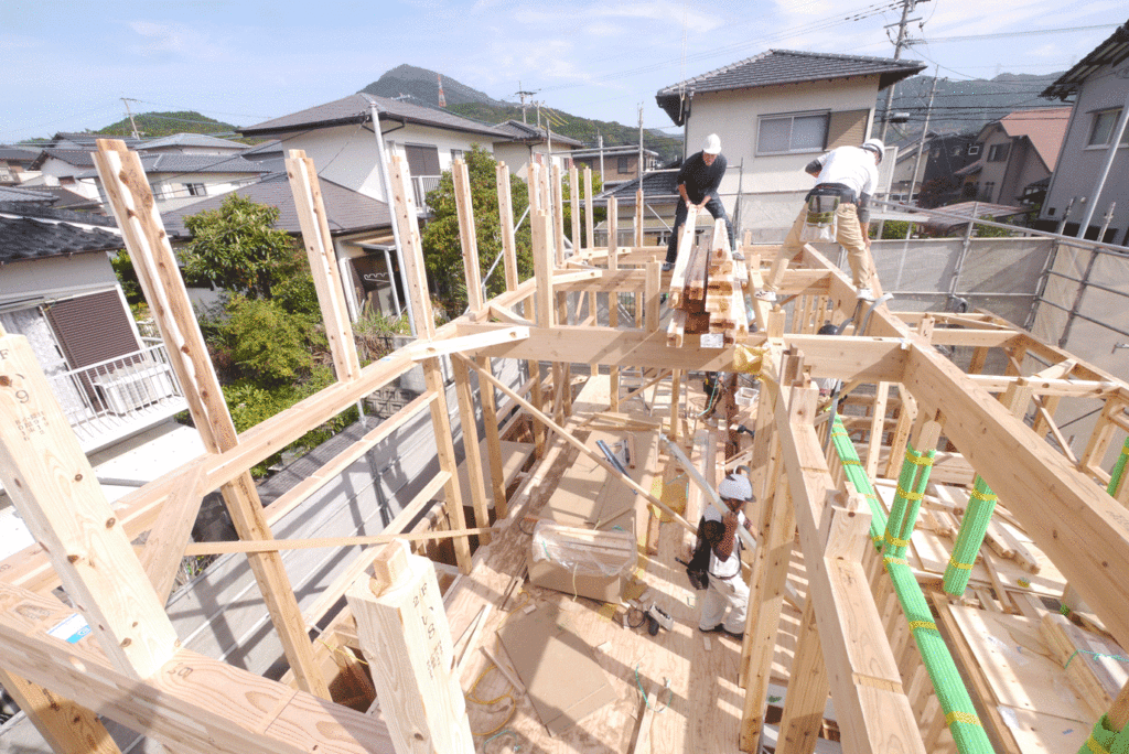 家の基礎工事が進み、その上に柱や梁を順に組んでいき、家の枠組みの最後に屋根の一番高いところへ棟木と呼ばれる水平材を収めることを棟上げと呼びます!