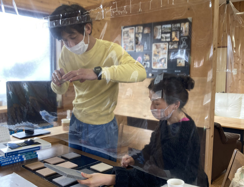 土間仕上げにするか、タイル仕上げにするか、F様は、タイル仕上げがご希望ということで、今度はタイルの色を決める事になりました!