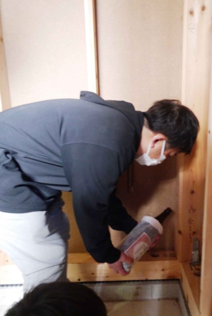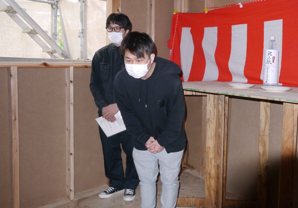 建物の四隅の柱に、お神酒、お塩、お米を撒いて今後の工事の安全、無事を祈念します!