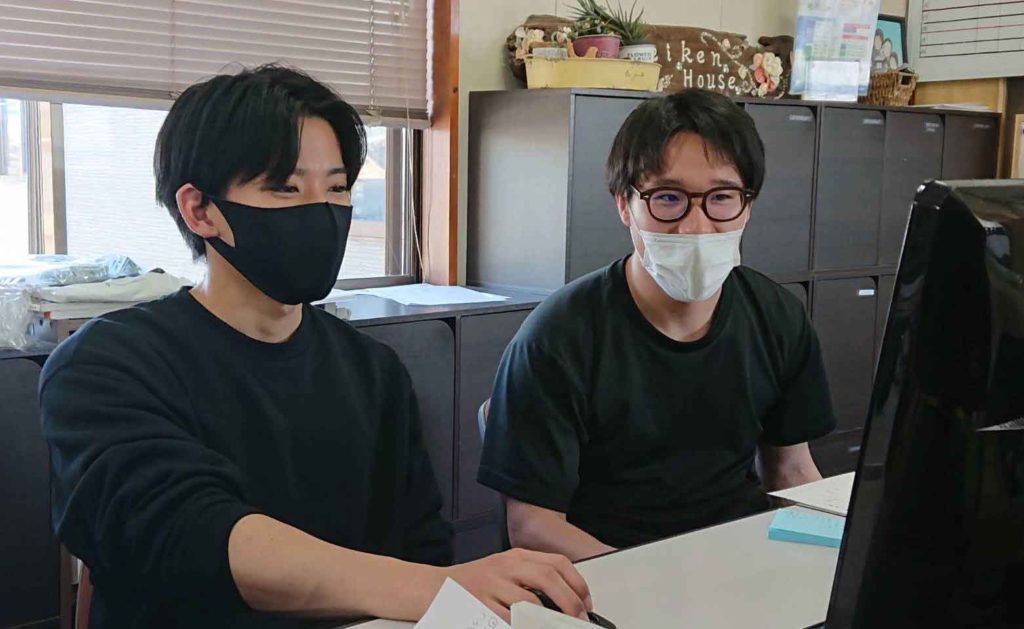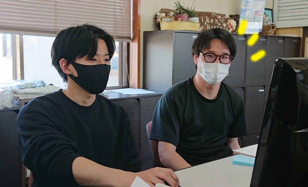 電気工事の現場が無事に終わったところで、事務所でもぎーちゃんからたくさんの事を教わる勢野くん♪