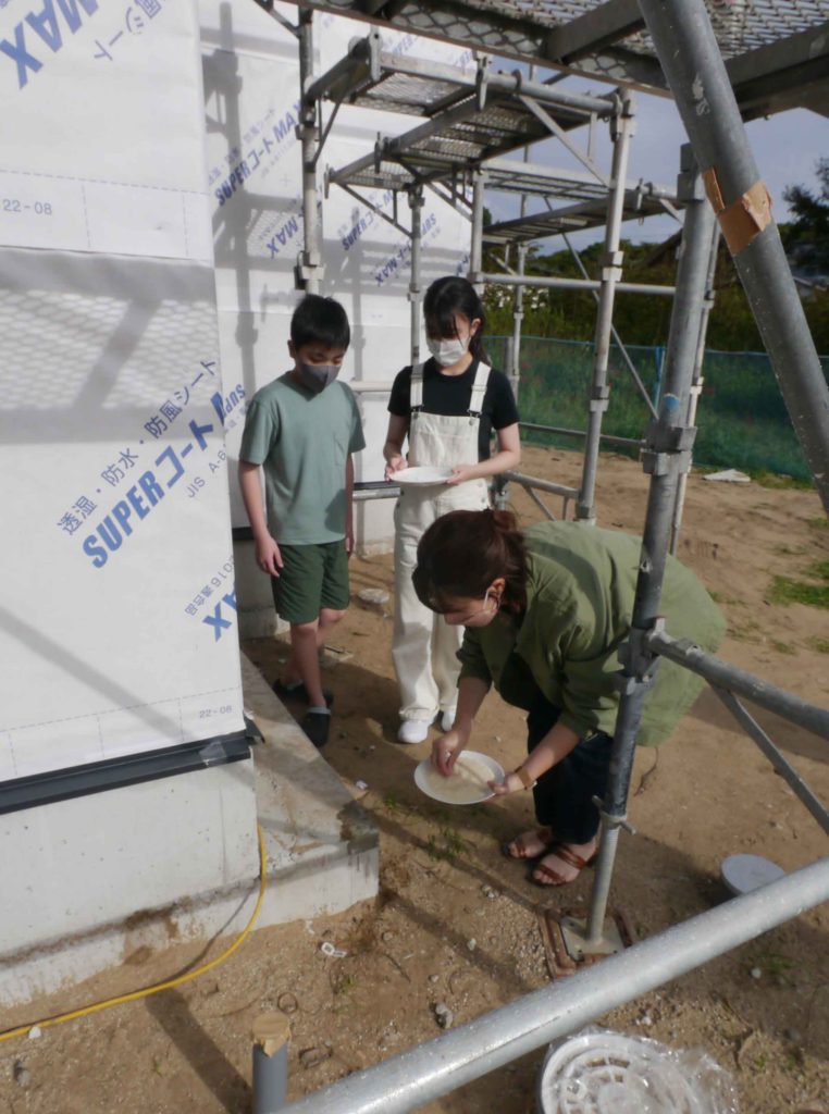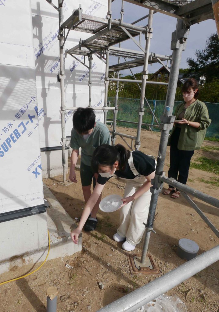 建物の四隅の柱に、酒・塩・お米を撒いて清め今後の工事の無事、安全を祈ります!