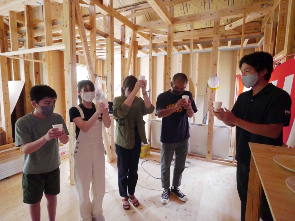 タグ: おめでたい / お祝い / 上棟式 / 乾杯 / 宗像市 / 新築一戸建て / 木の家 / 棟上げ / 注文住宅 / 福岡 / 餅配り