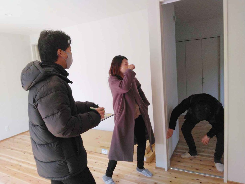 施主検査、もしくは竣工検査とも言いますが、施主様と一緒に、傷の有無や不具合、調整の必要な個所などを見ていきます!
