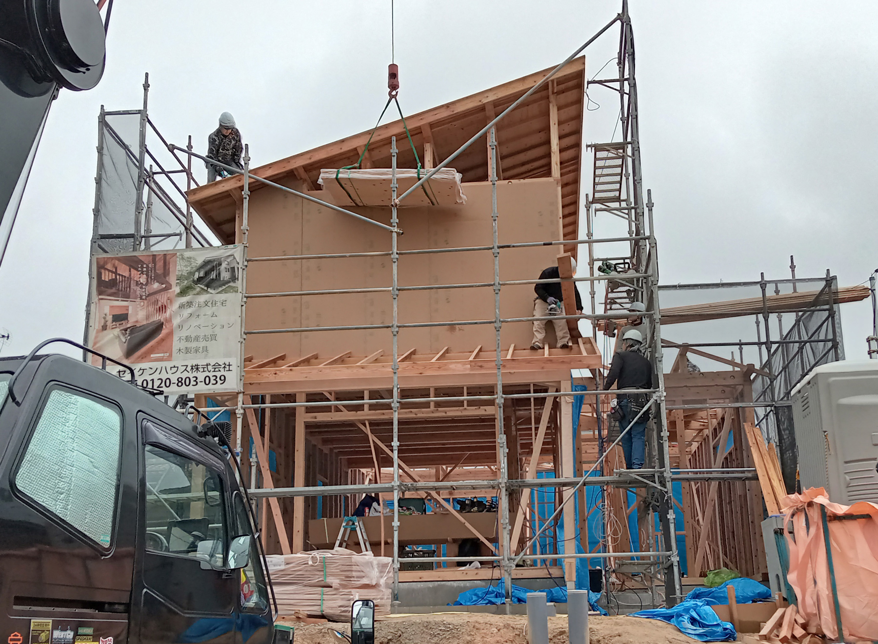 クレーンで面材を吊るし、一気に搬入します!