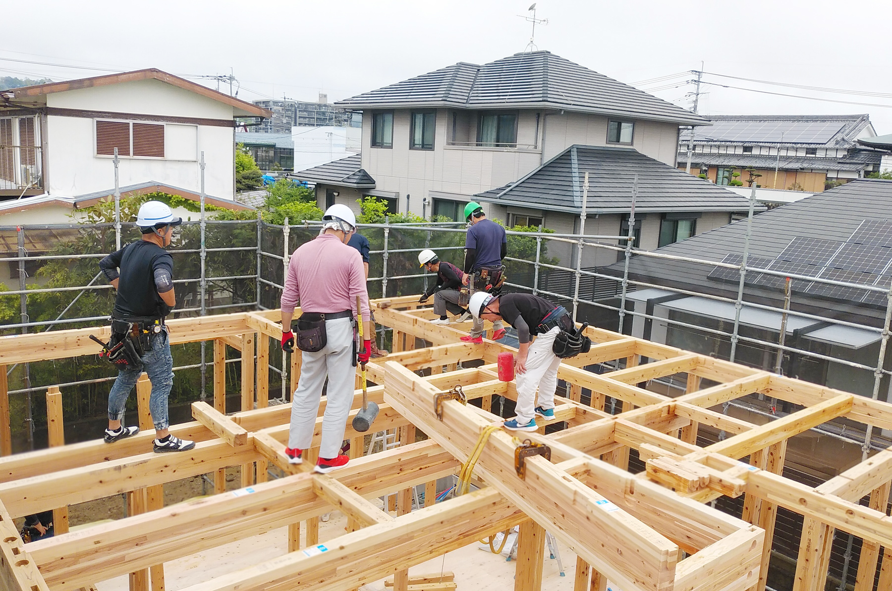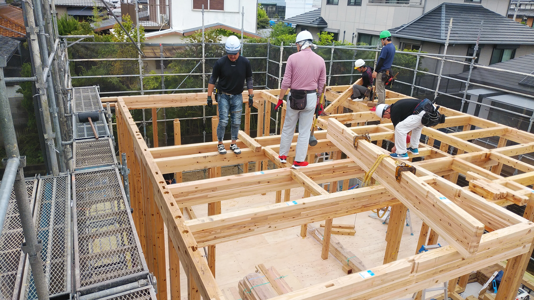 日頃の木工事とは違って応援の大工さんも加わり、大勢の大工さんたちで動く姿は圧巻です!