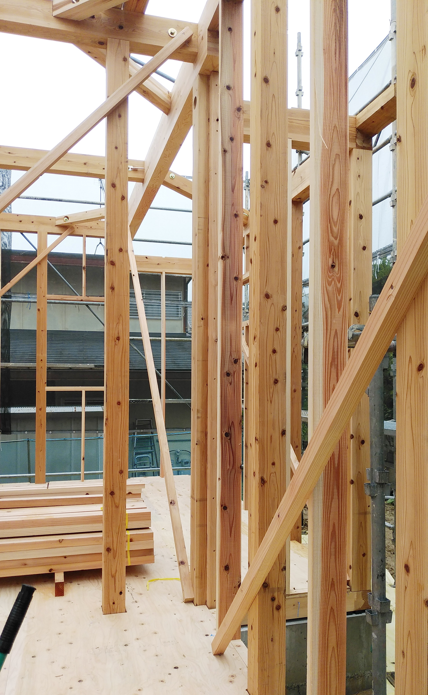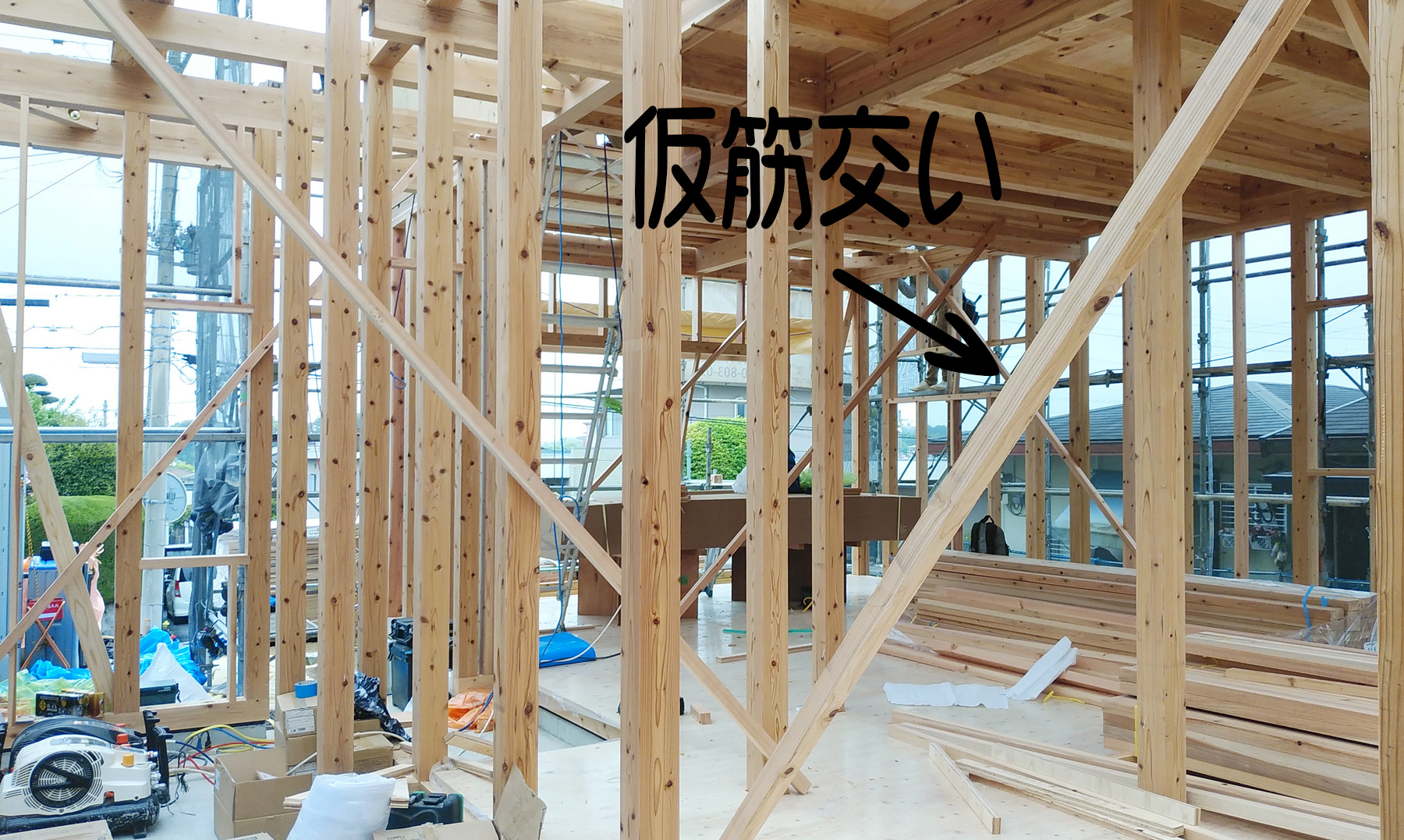 柱と横架材を組む時には、歪みが無いかをしっかりと確認し、仮筋交いと呼ばれる木材を斜めに取り付けて固定します!