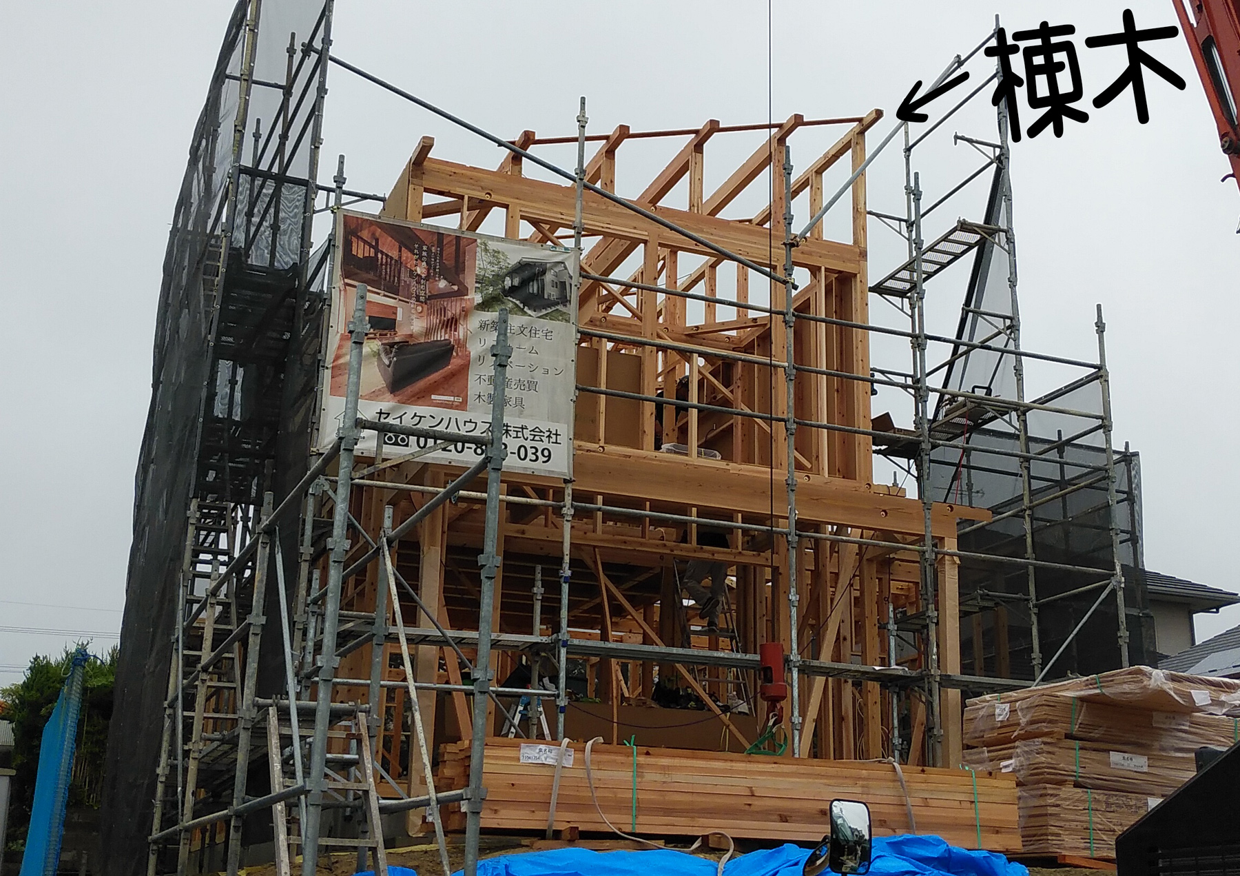 2階の施工が終わると、屋根の骨組みである小屋組みの工程に進み、棟木を設置します!