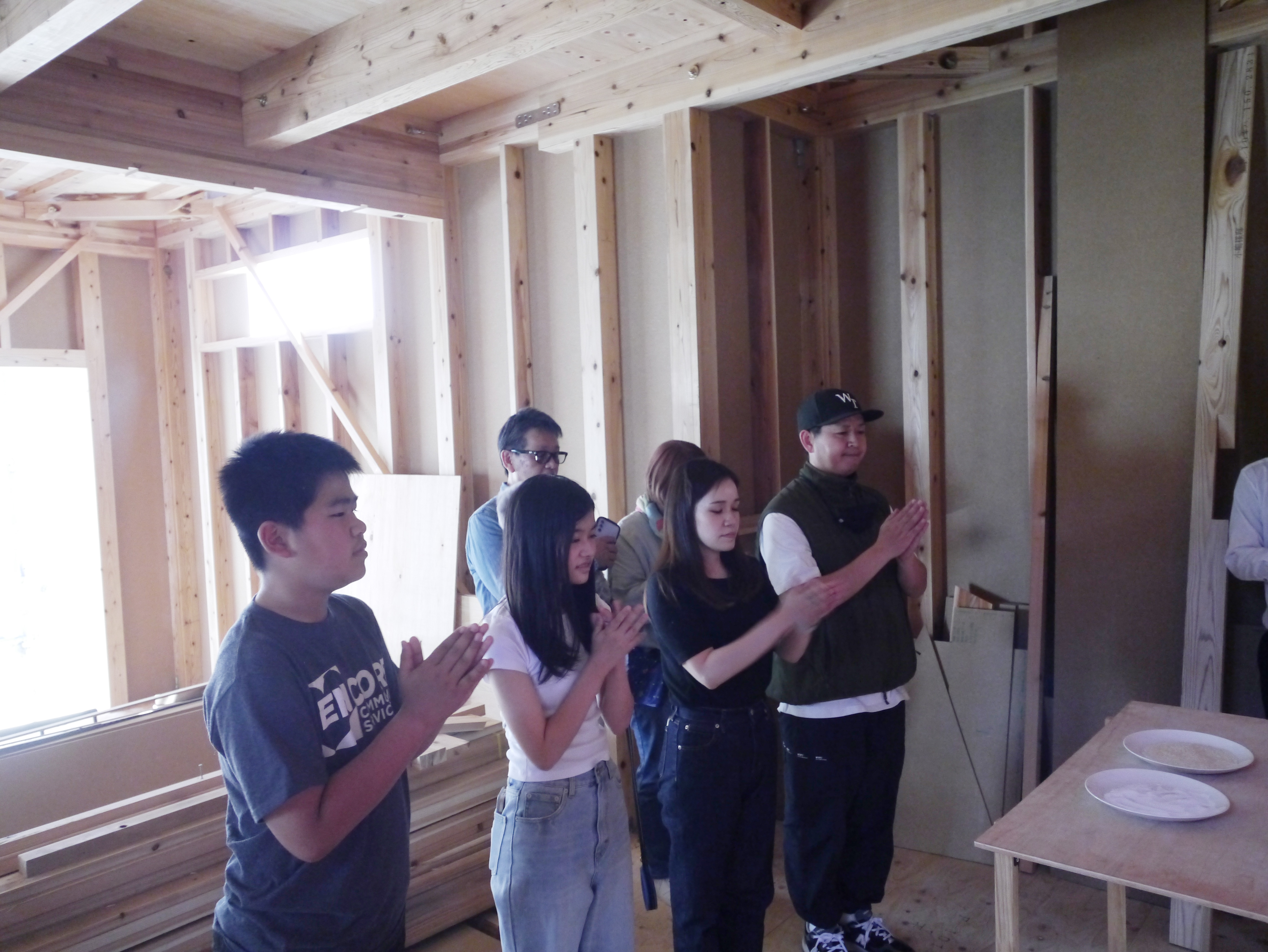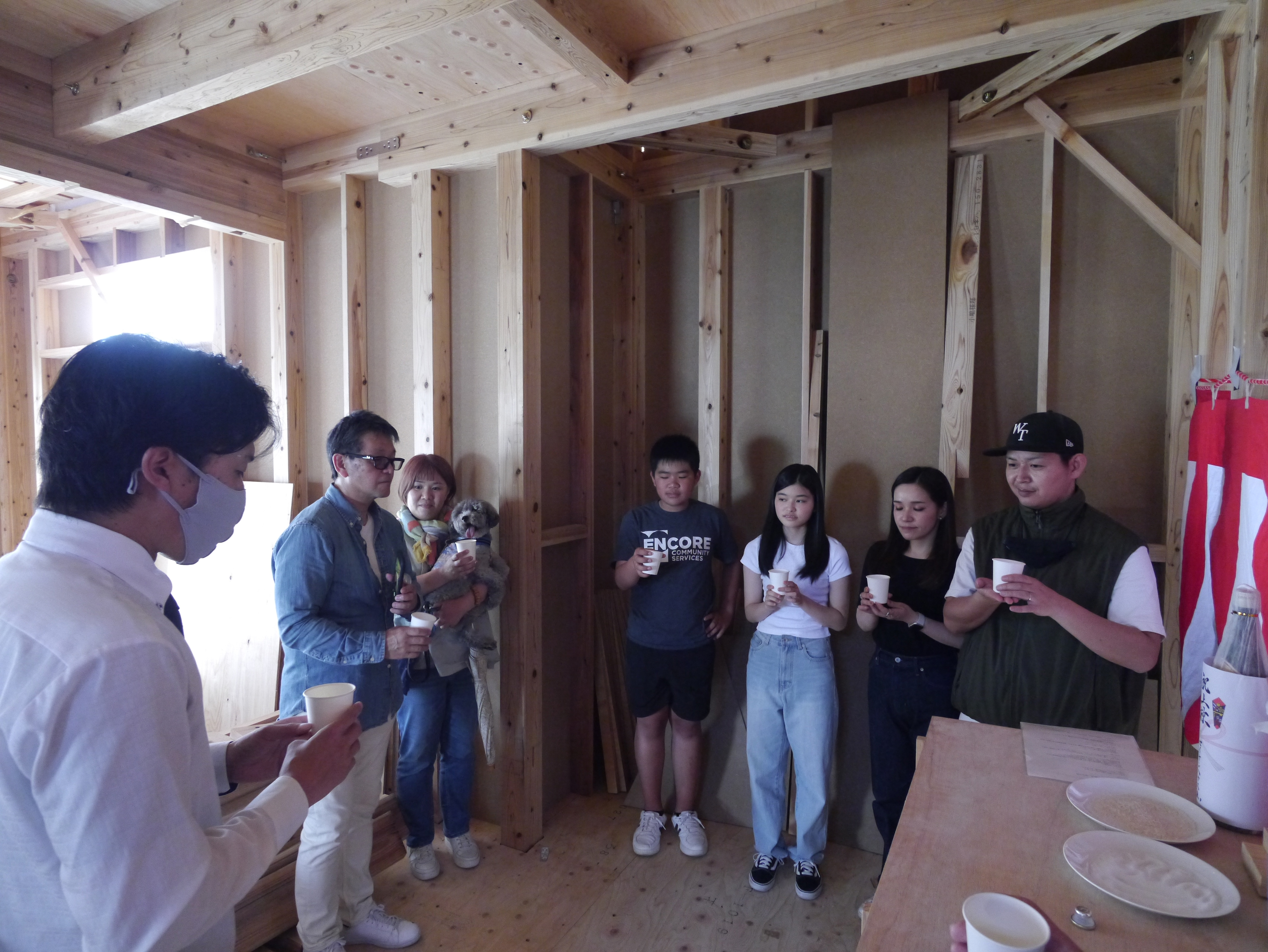 上棟のおめでたい日なので、『おめでとうございます!』のご唱和で行いました!