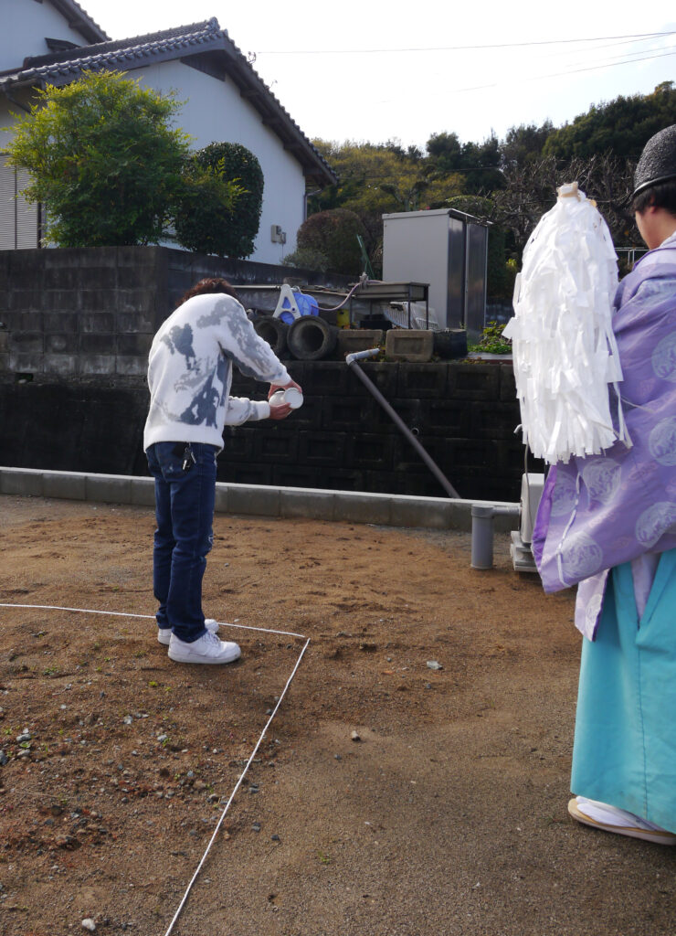 敷地の四隅を、お神酒、お塩を撒いて清めます!