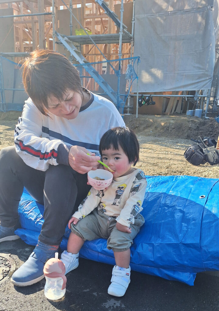 家が建っていく中、みんなで輪になっていただくお昼ごはんは、格別に美味しく感じます!