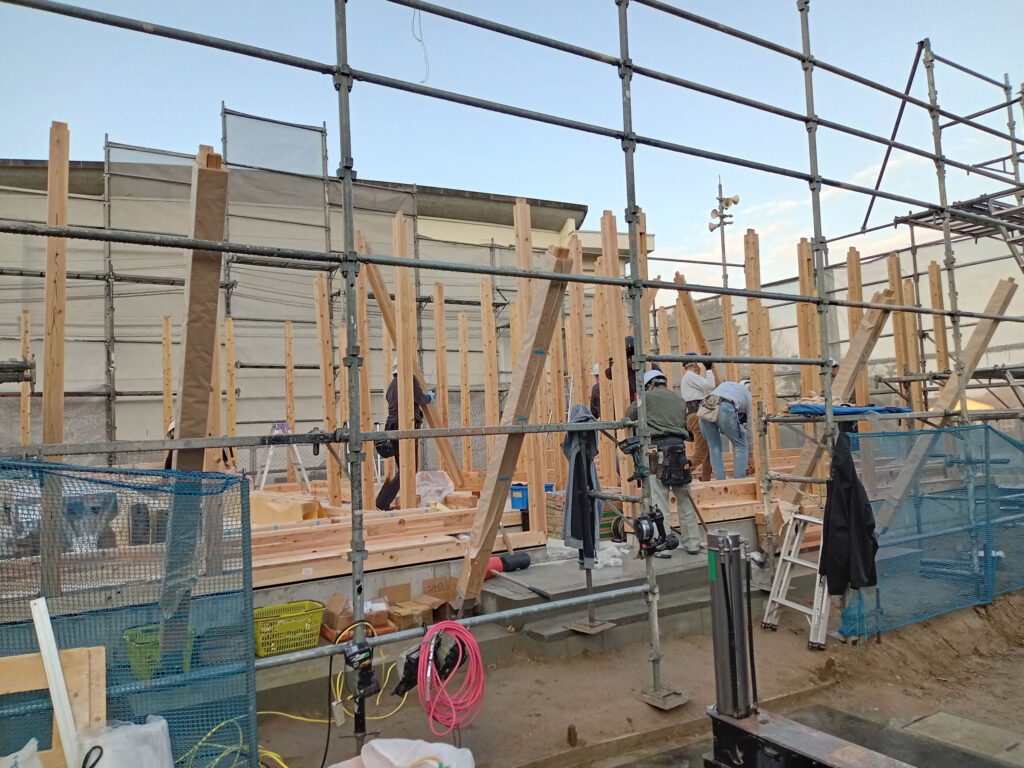 まずは、1階の柱を立てるところから始まります・・・
