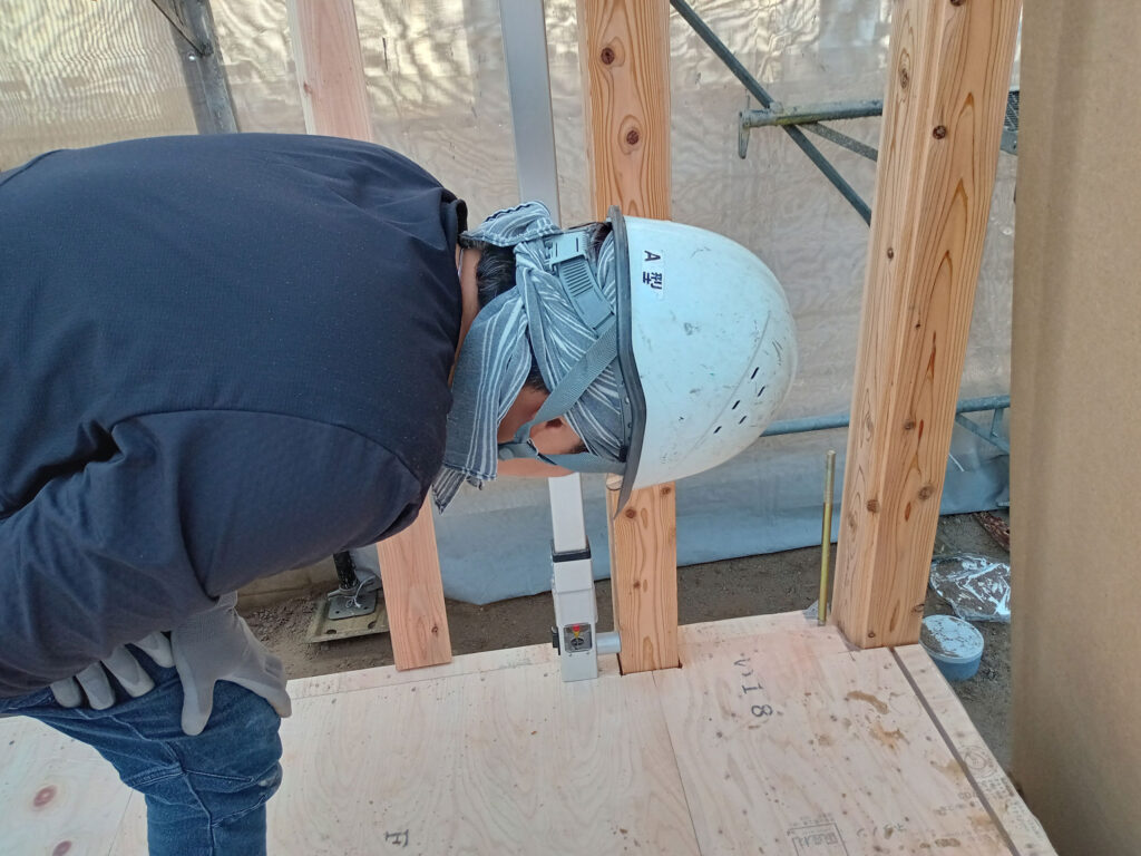 柱が立ったところで、歪みが無いかを確認します!