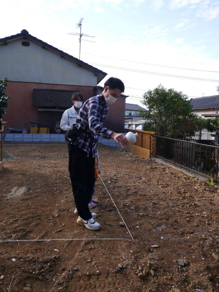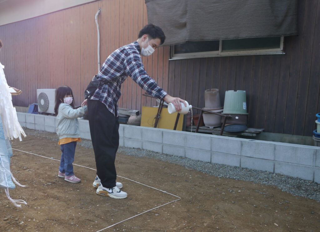 敷地の四隅をお神酒、お塩を撒いて祓い清めます!