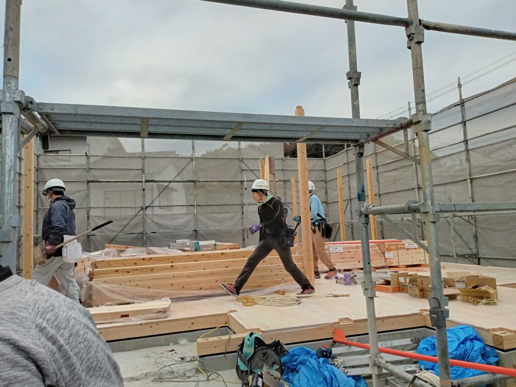 T様邸は平屋になりますので、1階の柱、梁の施工が終わると小屋組みに進みます!