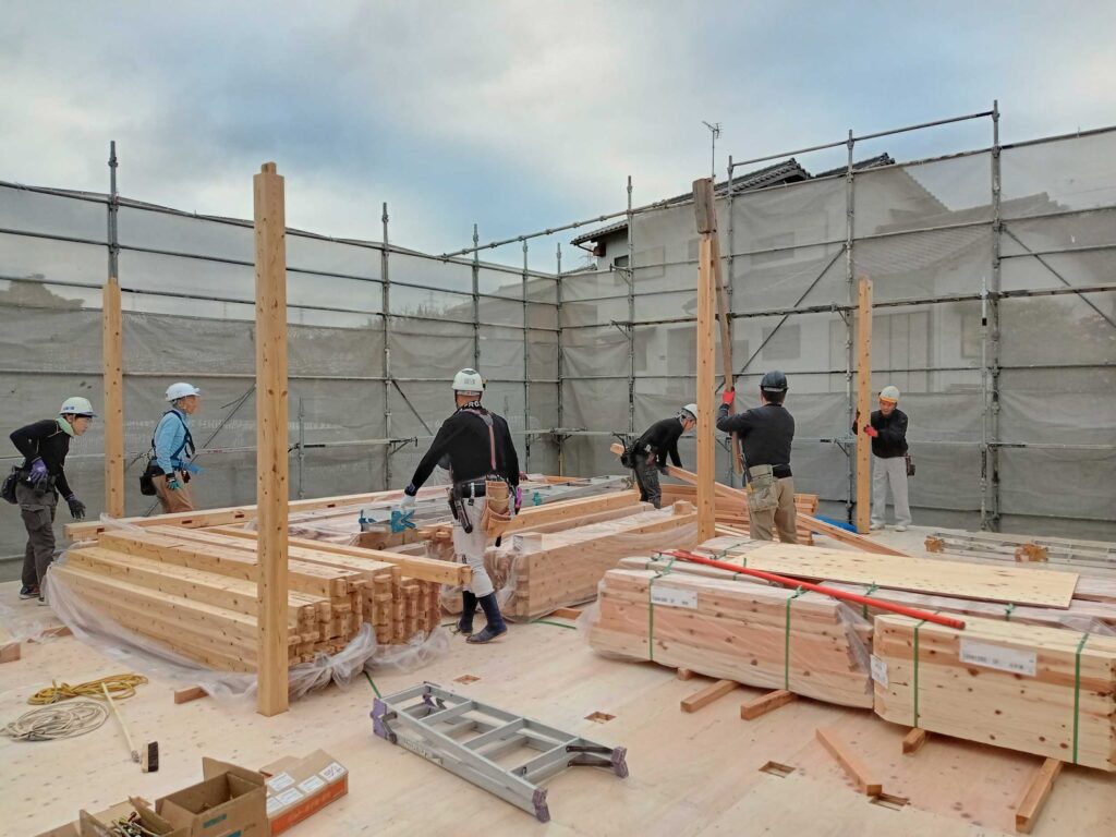 施主様が住まわれた時に、少しでも快適な時間を過ごしていただけるよう、棟上げの現場では、大工さんたちの技が光ります!