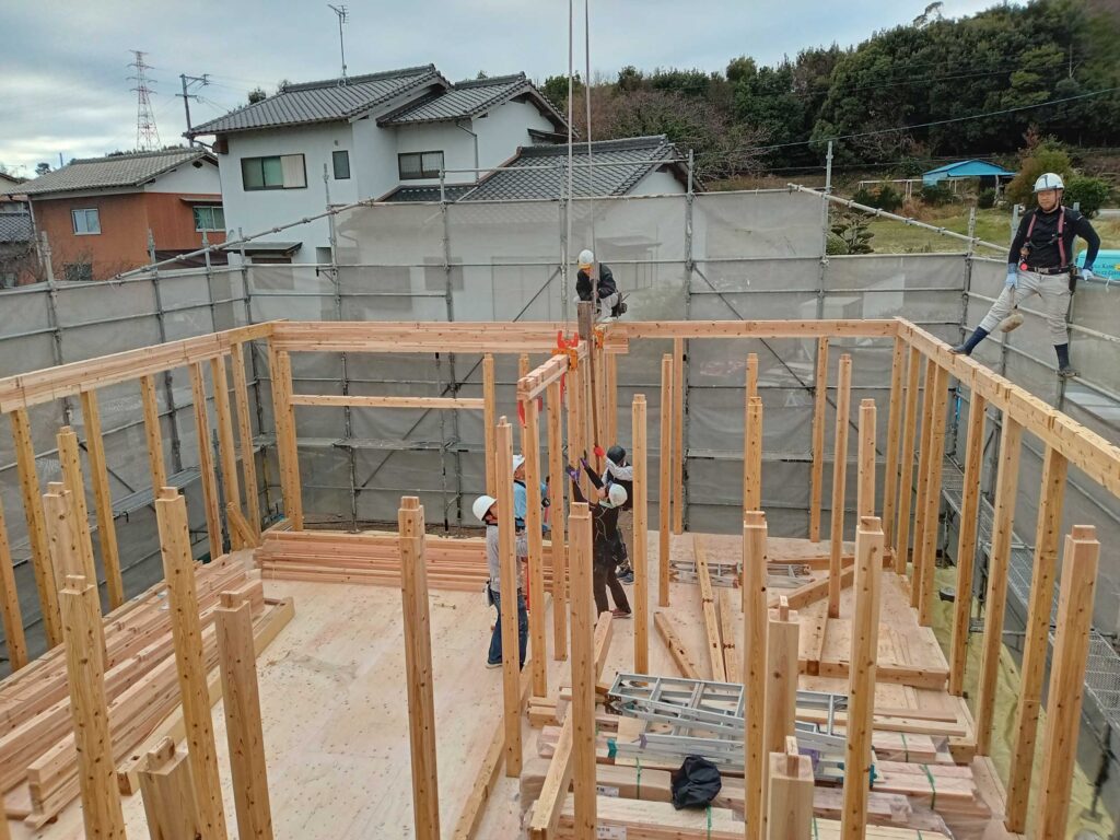 前日までに1階床板の施工まで進んでいるので、上棟日当日は、まず1階柱を立てるところから始まります!