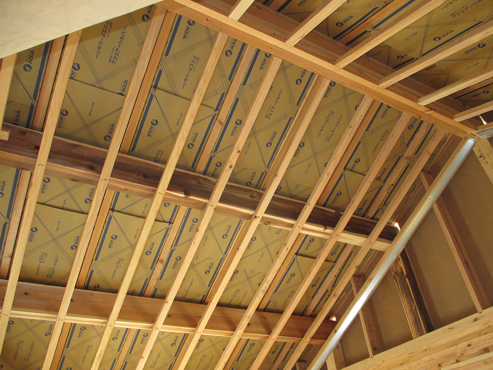 須恵町上須恵 T様邸の幸せづくり状況です~♪ 大工工事が行われています! 天井・下地組が完了しました! この上に吹き付け断熱工事を施します! 次の工程に進みます~♪