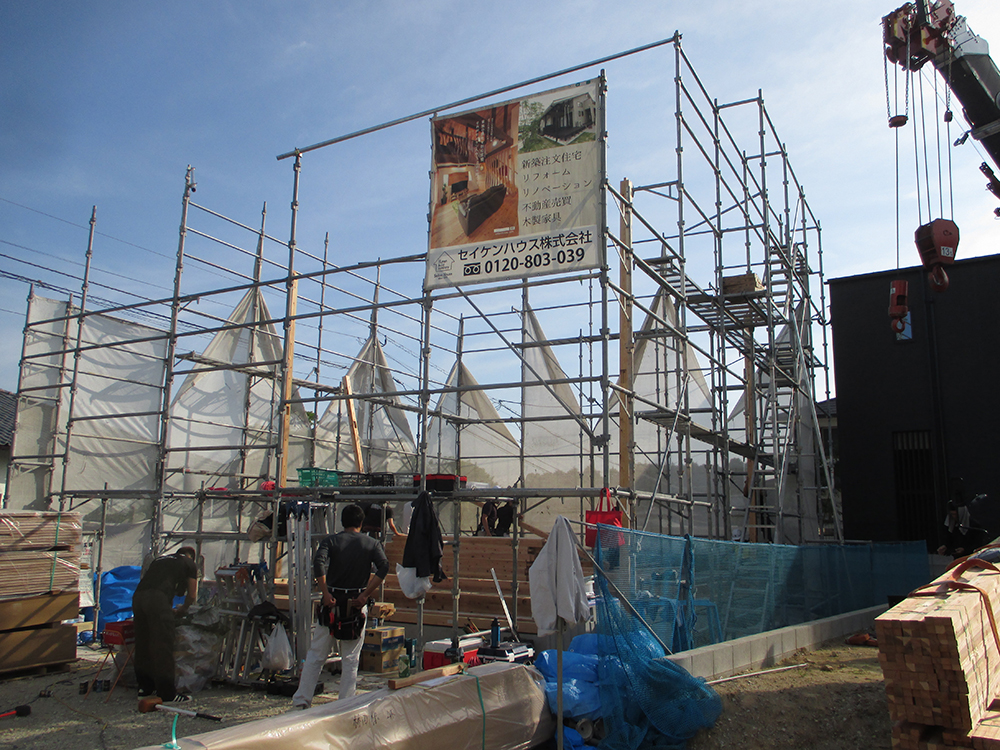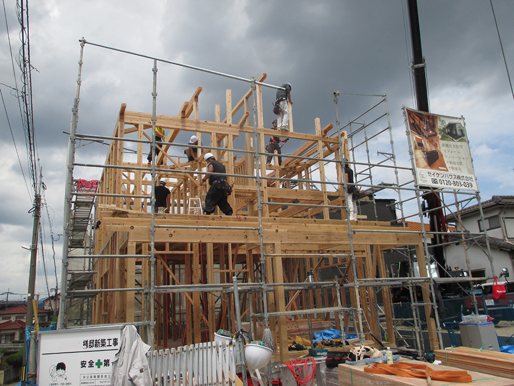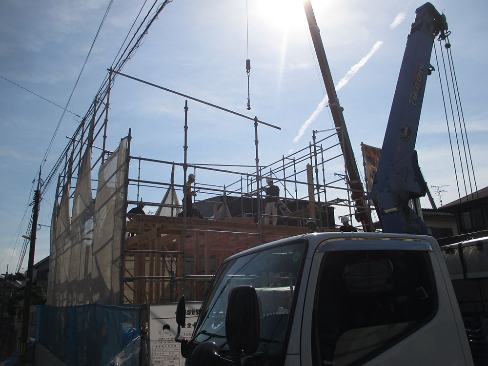 棟上げとは、大工さんが中心になり、組み立て手順にそって軸組みの組み立てを行い、一番高い棟木を設置する一連の作業を言います!