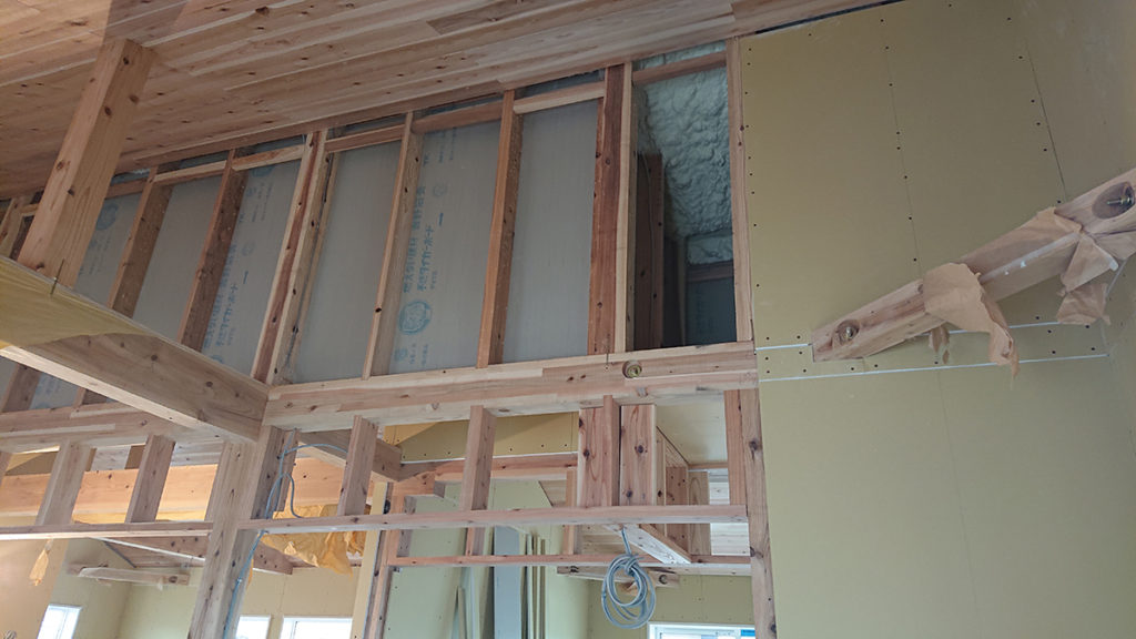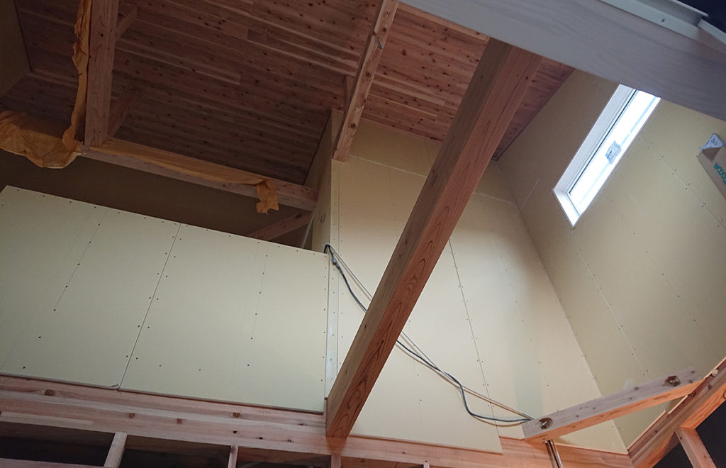 断熱材を吹付、電気配線などを行った後にプラスターボードを壁に貼っていきます!
