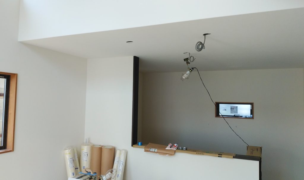 志免町T様邸の幸せづくり状況です! クロス工事の様子です! 断熱材を吹き付け、電気配線などを行った後にボードを打ち付ける工事を行うと、壁の土台の出来上がりです! ボードの上の凹凸をパテで均一に均したらクロス...