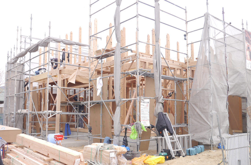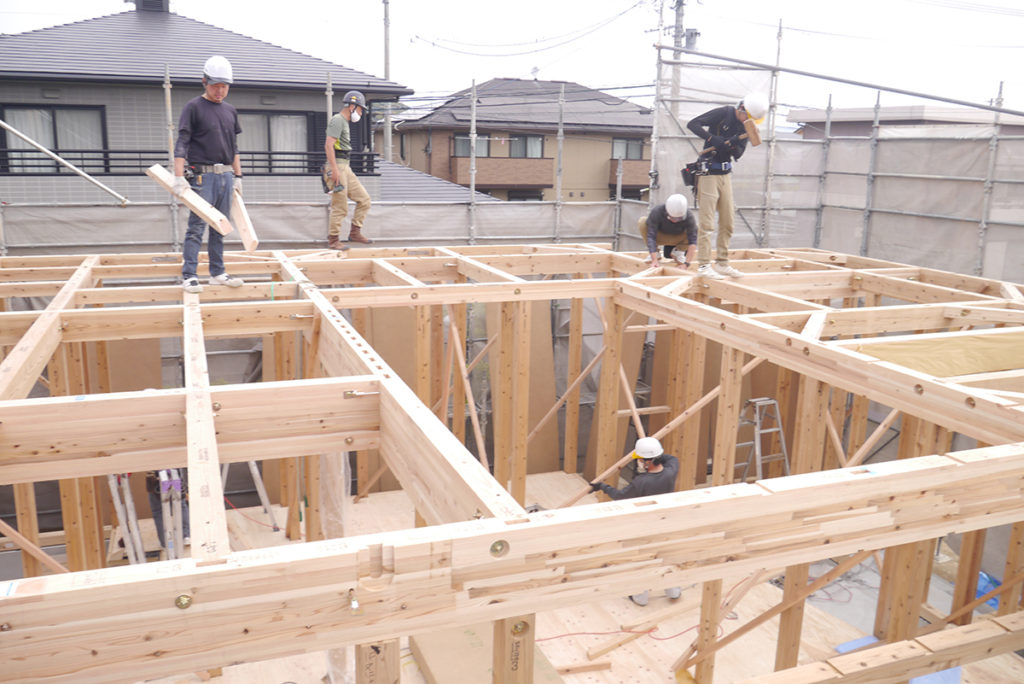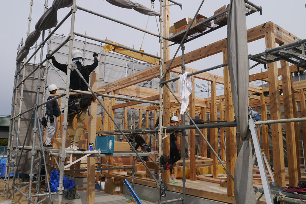前日までに、一階の床断熱、床板の施工まで進めているので、当日は一階の柱を立てるところから始まります!