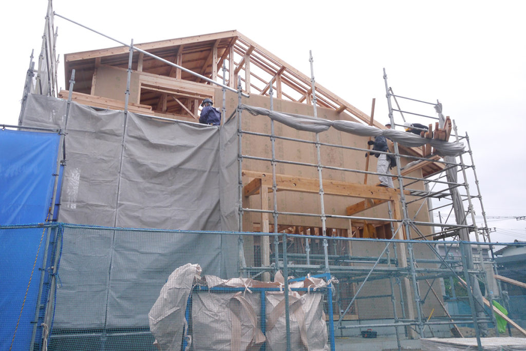 屋根工事が終わり、防水シートを野地板の上に施したら、この日の作業は終了です!