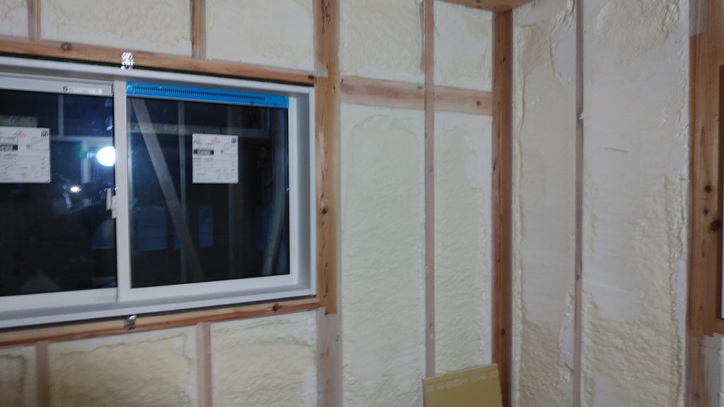 断熱材を吹き付け、電気配線などを行った後に、ビスを均等間隔で打っていき、プラスターボードを貼ります!