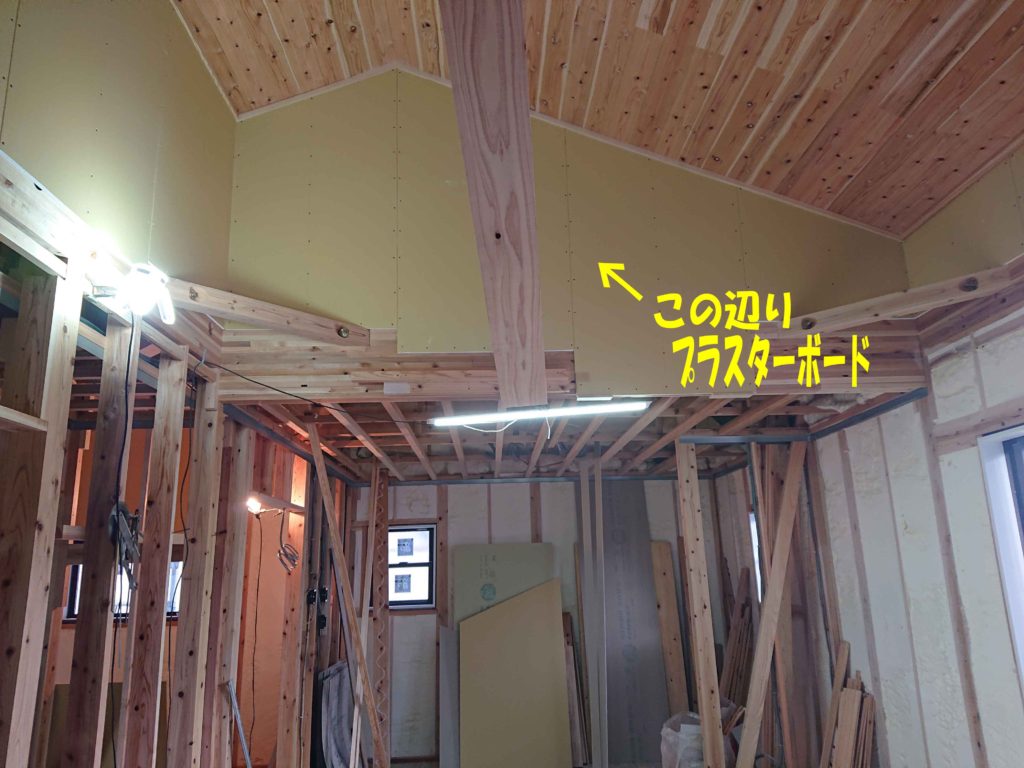 断熱材を吹き付け、電気配線が終わった後にビスを均等間隔に打っていき、プラスターボードを貼ります!