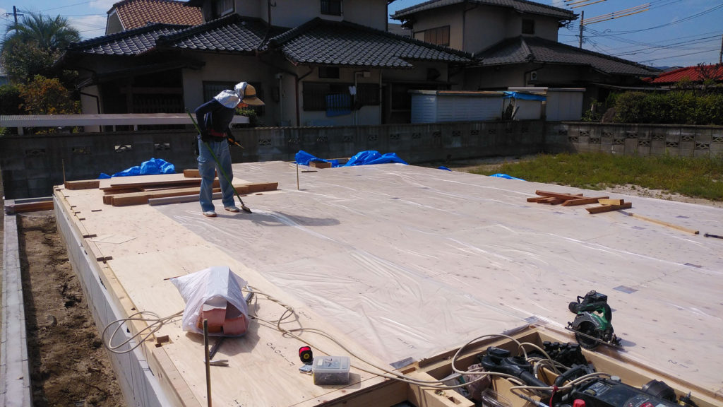 土台敷きが完了したら、土台や大引の間に断熱材を設置し、1階の床板施工まで終わらせます!