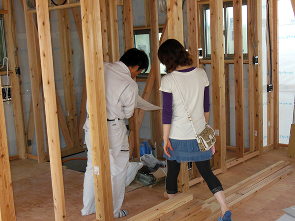 陵厳寺Y様邸の電気配線打ち合わせの様子です♪ 電気配線の打ち合わせは施主様が使いやすいように、図面上だけではなく実際の現場で行います。 場所、電気の種類、スイッチの位置・数等々。 客さまの生活に合った、使いやすい電気配線...