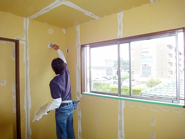 陵厳寺Y様邸のクロス工事の様子です♪ ビスの後の凹凸を均す為、パテで平らにしていきます♪ そしていよいよクロス貼りが開始しました!! ムラがないように丁寧に貼っていきます♪