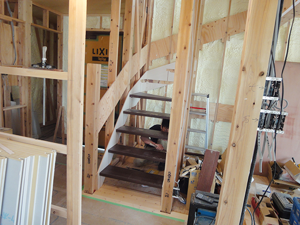 南区和田N様邸の造作の様子です♪ 大工さんが階段を作っています!! このようにつくられていく様子を見ることはなかなか無いので貴重ですね♪ 素敵な階段が出来上がるのが楽しみです♪ それから、コチラはボードを貼っている所です...