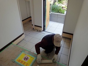 南区和田N様邸の左官工事の様子です♪ お家の顔となる玄関のタイル貼りを行いました♪ サイズが合うようにカットをし、はめ込んでいきます。 竣工まであもう少し!! 進行が楽しみです♡