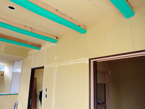 南区和田N様邸のボード貼りの様子です♪ 断熱材を吹付け、電気配線等行ったあとに、ボードを打ちつける工事を行うと、いよいよ壁の土台のできあがりです♪ 打ちつけた後の凹凸をパテで均一にしたら、クロス工事に入ります! クロスは...