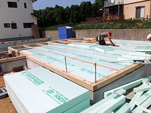 さらに、床の断熱材を入れていき、その上から木の板(実際に見える床材の下にある板)を貼っていきます。