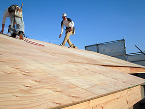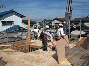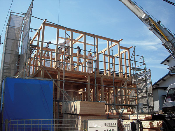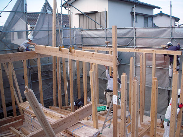 木造住宅の建設工事が進み、梁や柱などの骨組みをつくっていきます。