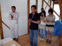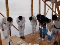 四隅の柱に酒や塩、米などをまき、天地四方の神を拝みます。